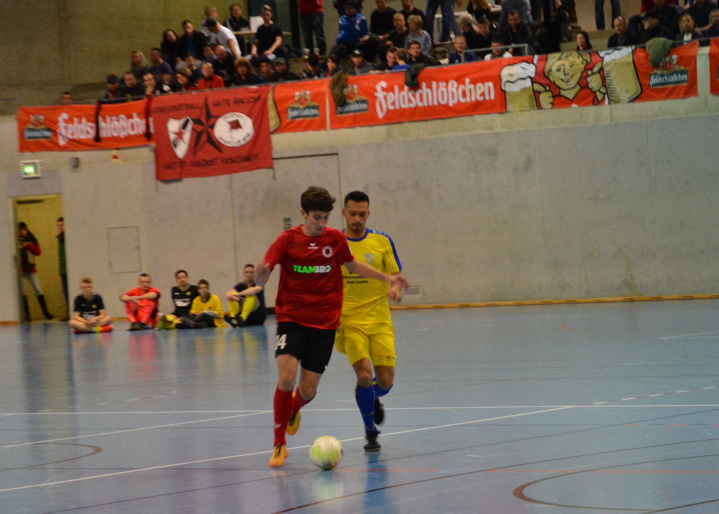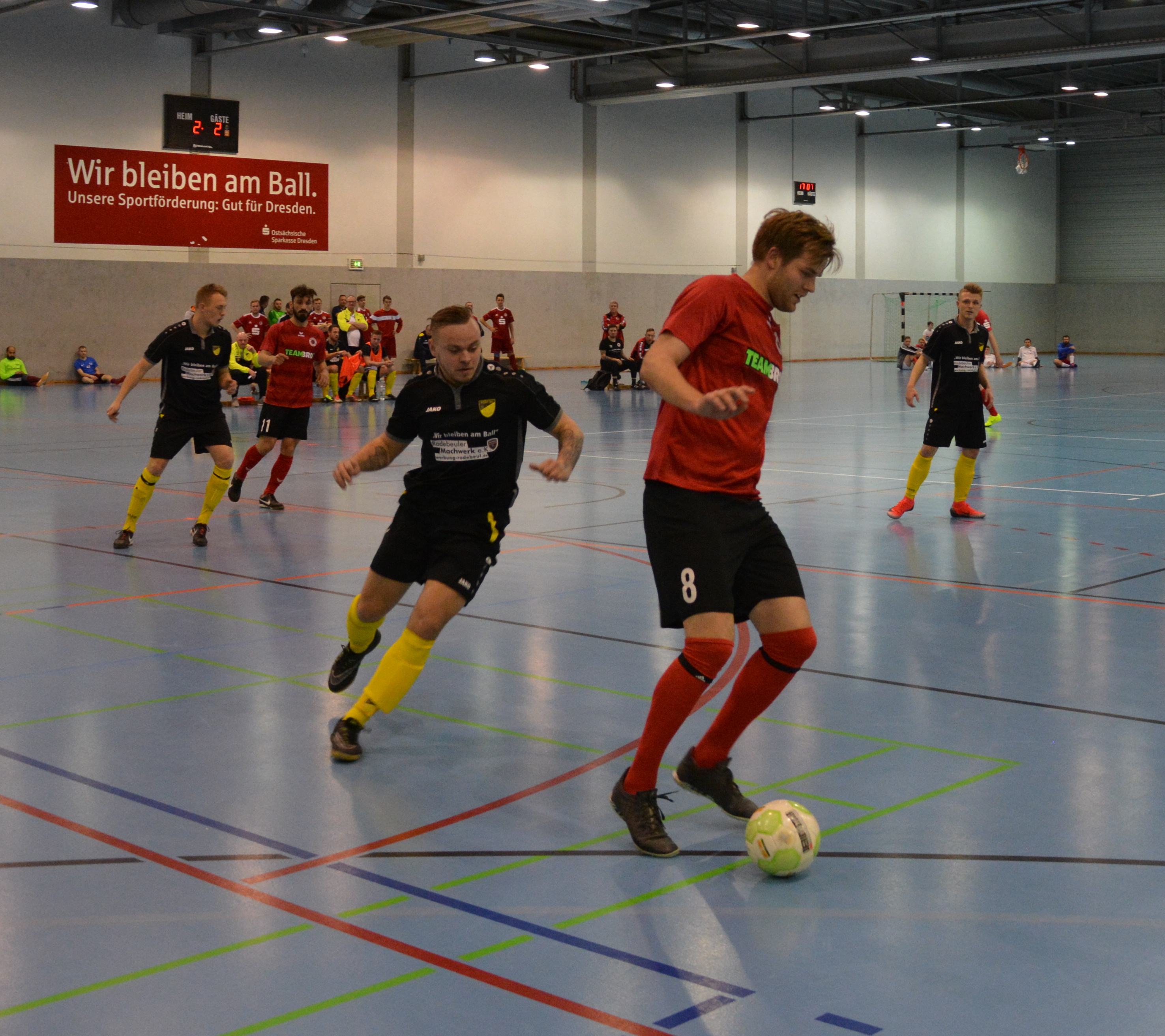 Den Schwung vom ersten Spiel nimmt man mit in die zweite Vorrundenpartie gegen den Post SV Dresden. Bereits nach zwei Minuten führen die Schwarz-Mohnroten durch einen Doppelpack von Robert Thomas mit 2:0. In der Folge hat man das Spielgeschehen unter Kontrolle und der Pfosten verhindert beim Weitschuss von Timo Hoffstadt den dritten Treffer der Partie. In der 8.Min kommt der Post SV Dresden per direkt verwandelter Ecke von Felix Urbanski zum Anschlusstreffer. Die Kicker von der Hebbelstraße wittern ihre Chance und erzielen 20 Sekunden vor der Schlusssirene durch Felix Urbanski noch den 2:2 Ausgleich. Damit verpasst man den vorzeitigen Einzug ins Halbfinale.