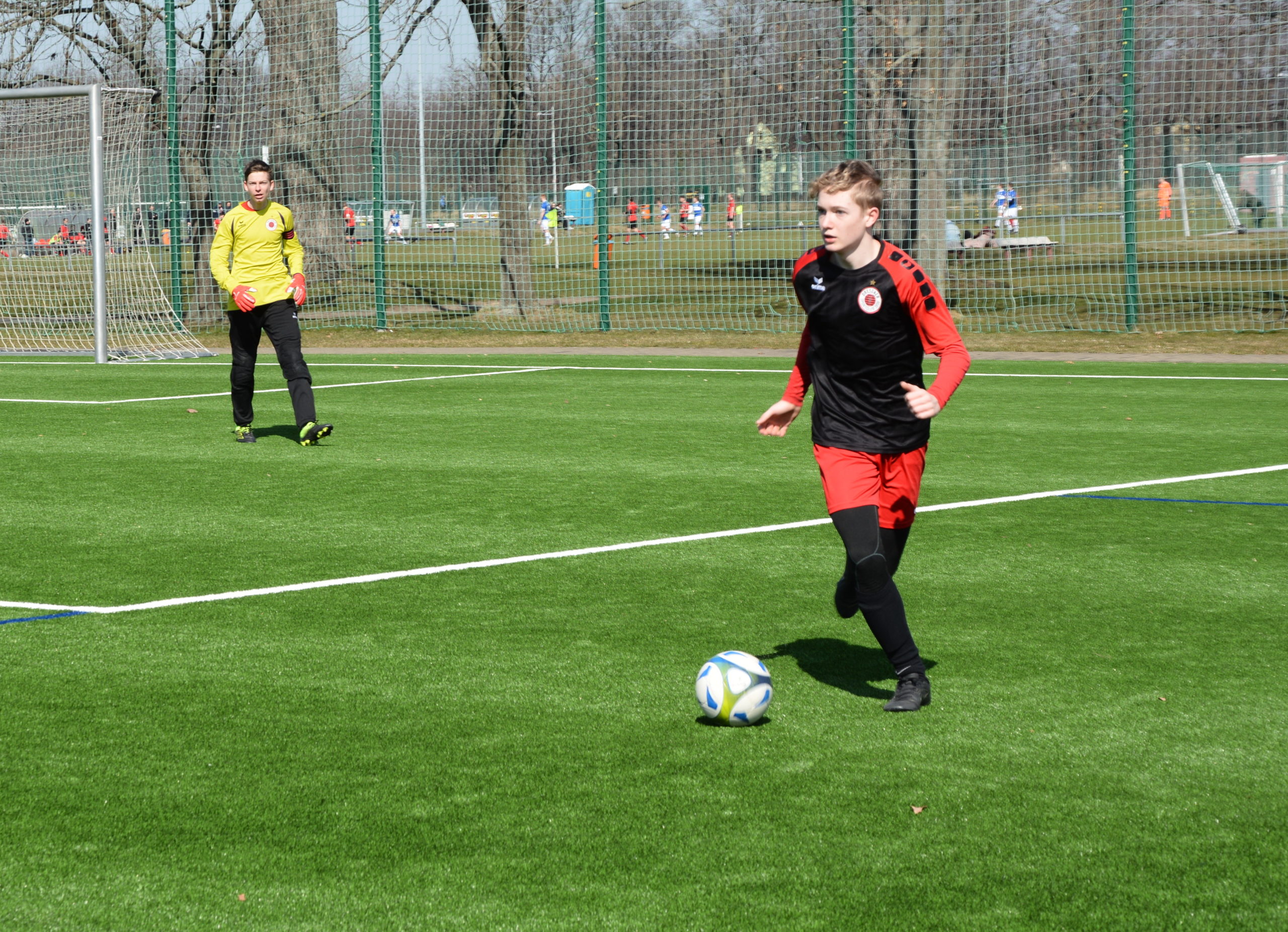 Gegen den Favorit besitzt der Dresdner SC die erste Tormöglichkeit. Jonas Ballhause wird geschickt und taucht allein vor dem Tor auf. Im Eins-gegen-Eins scheitert er aber an Torhüterin Mika Gaub. Im Gegenzug kommt auch Rotation zu seiner ersten gefährlichen Torraumszene. Emil Dugué dribbelt in den Strafraum rein und kommt zum Abschluss. Der Ball wird aber noch vor der Linie von einem Abwehrspieler geklärt. Die Gäste kommen immer besser in die Partie und suchen immer wieder per Fernschüsse den Abschluss. Diese bringen aber nichts ein. Ein Eckball führt in der 18.Minute zum ersten Gegentreffer. Am zweiten Pfosten steht Cristiano Pfuhland völlig frei und vollendet per Fuß zum 0:1. Nur drei Minuten später gelingt Rotation der zweite Treffer. Per flachen Schuss von der Strafraumgrenze kann Emil Dugué DSC Torhüter Ferdinand Schulz überwinden. Kurz vor dem Halbzeitpfiff verhindert Ferdinand Schulz und die Latte einen höheren Rückstand. Einen Fernschuss von Elias Naoui lenkt Schulz noch an den Querbalken. Bei der anschließenden Ecke prüft Elias Naoui erneute die Stabilität der Latte.