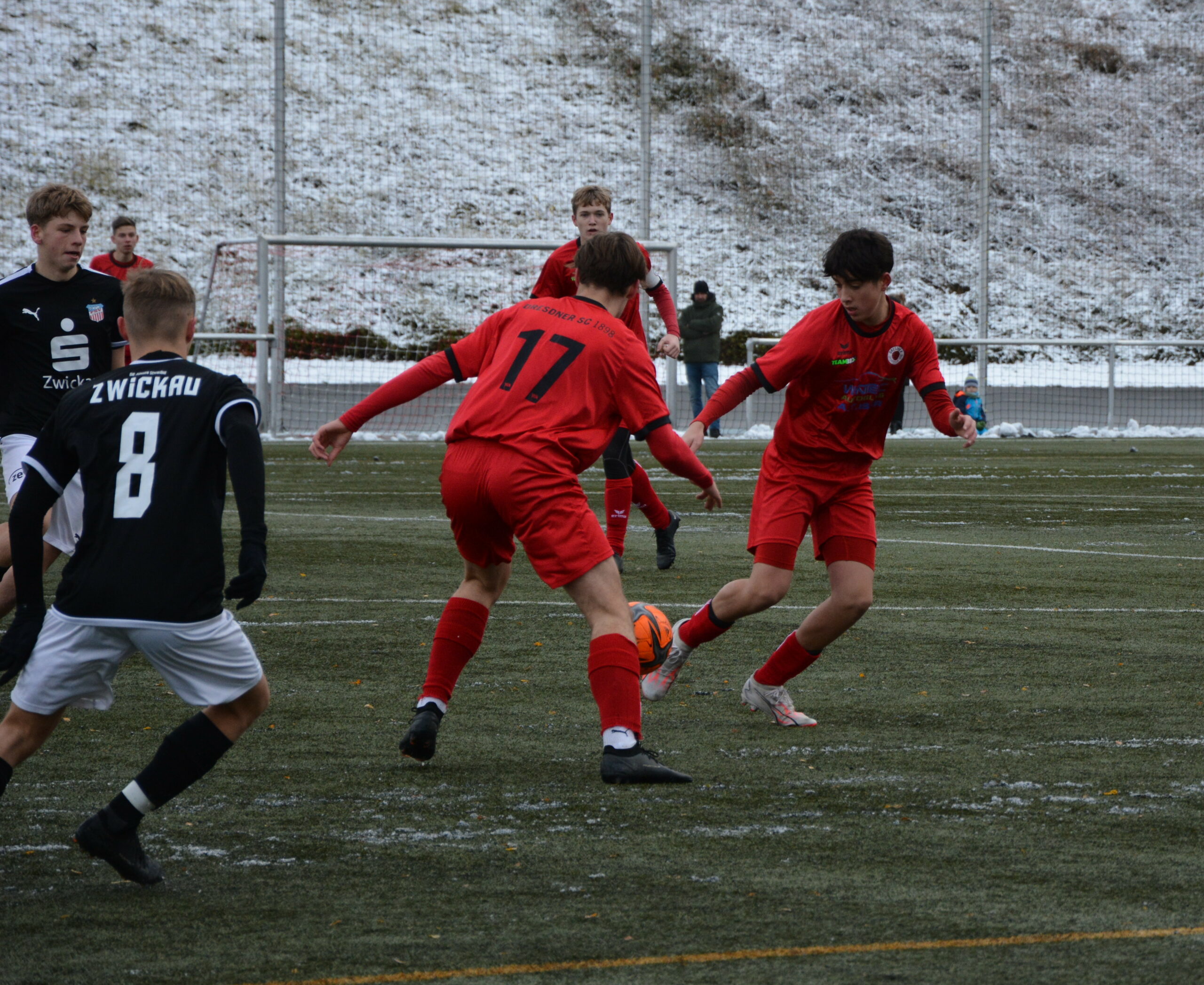 Am 11.Spieltag in Sachsens höchster Liga kann die U17 ihren ersten Sieg feiern. Bei winterlichen Bedingungen gewinnt man das Auswärtsspiel beim FSV Zwickau mit 0:3. Dabei gelingt Anton Zobel ein Doppelpack. Den dritten Treffer für den Sportclub erzielt Roberto Hilbert.