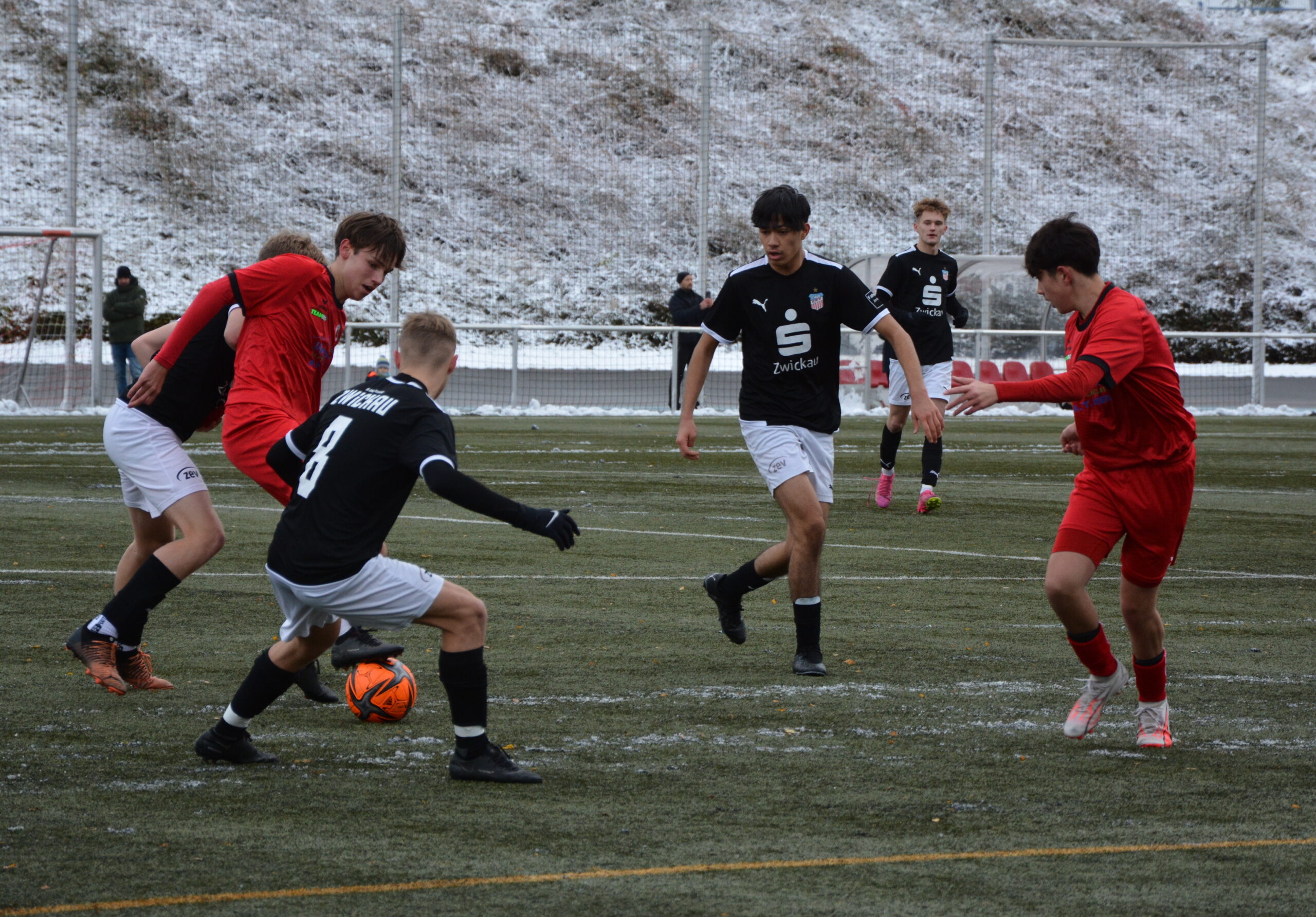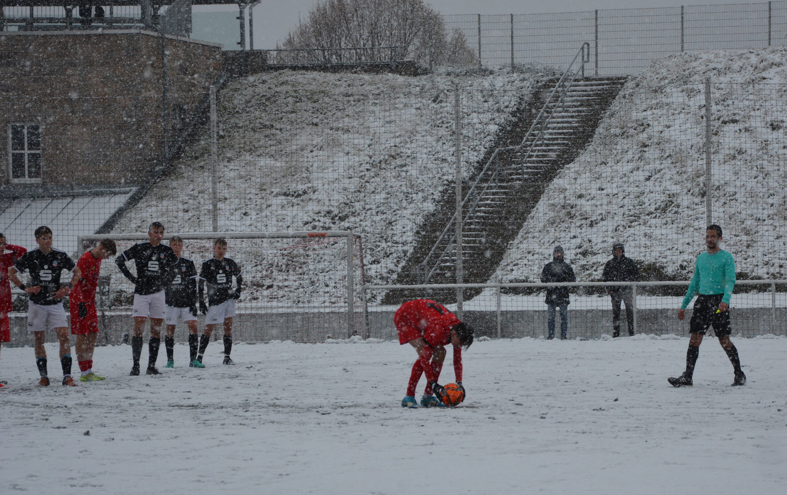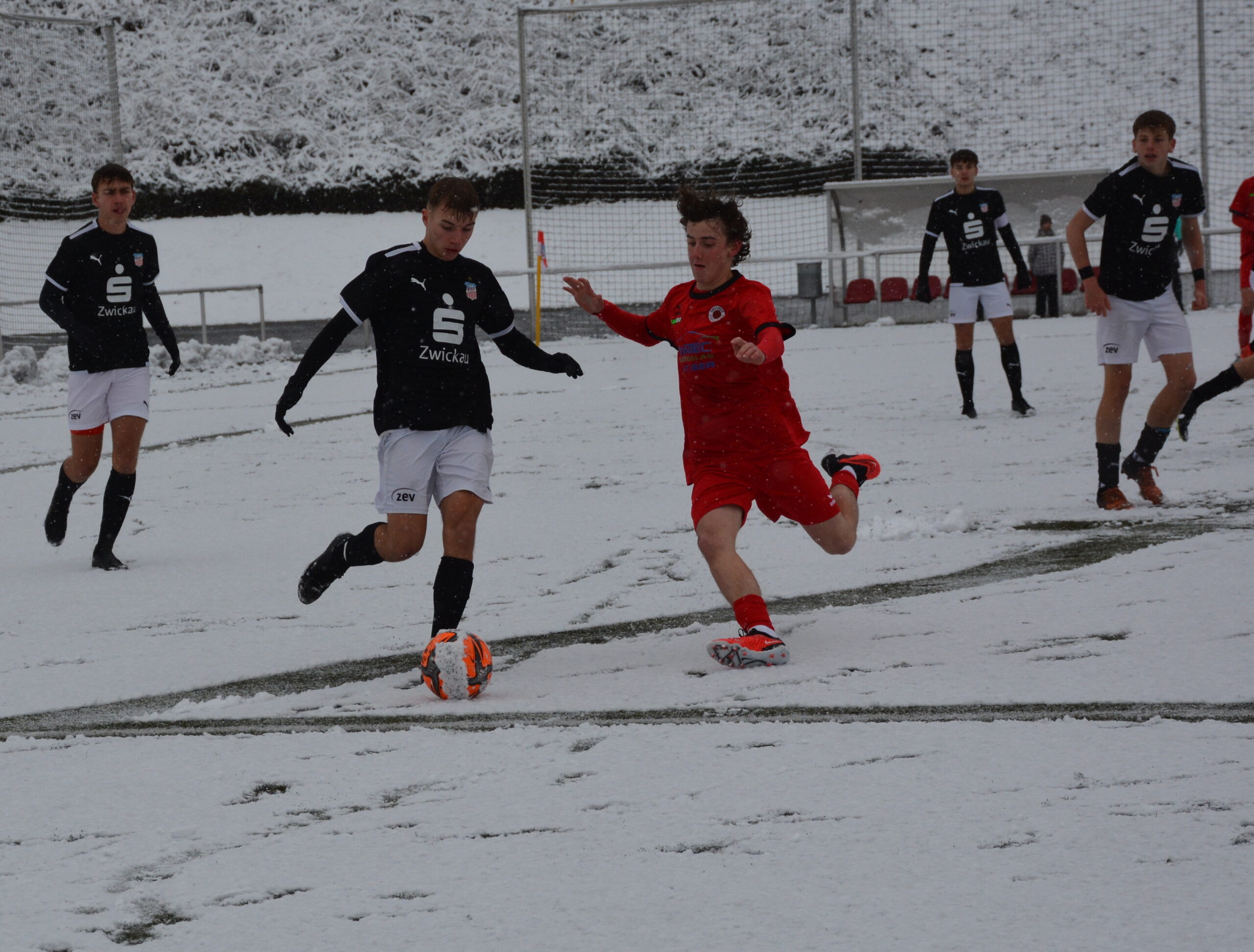Aufgrund des immer stärkeren Schneefalls kommt nach der Pause erst einmal der Schneeschieber zum Einsatz und die zweite Halbzeit wird auf weißen Untergrund angepfiffen. Es sind vier Minuten rum als ein Zwickauer nach einer Ecke zum Kopfball kommt. Dieser wird auf der Linie geklärt. Mit zwei starken Paraden, jeweils nach Abschlüssen von Jannes Gutzeit aus der Nahdistanz, hält Anton Konta seinen Kasten weiterhin sauber (55.). Dies sollte aber die letzte gefährliche Torraumaktion des FSV Zwickau sein. Die Schwarz-Roten kommen immer besser mit den äußeren Bedingungen zurecht und erspielen sich ein leichtes Übergewicht. Nach einer Flanke von Arash Hosseini von der rechten Seite zieht Roberto Hilbert in der Mitte sofort ab. Sein Schuss geht nur knapp am Pfosten vorbei. Erfolgreicher ist er nach einer Stunde Spielzeit. Hilbert zieht aus 20 Metern aber und der abgefälschte Ball senkt sich hinter Torhüter Malek Salame in den Kasten. In der 72.Spielminute wird Constantin Neumann im Strafraum gefoult und der Schiedsrichter zeigt auf den ominösen Punkt. Anton Zobel tritt an und verwandelt den Elfmeter sicher zum 0:3. Kurz vor dem Ende wird eine schöne Kombination über die rechte Seite nicht mit einem Torerfolg belohnt. Nach einem Pass von Zobel in den Rückraum der Abwehr setzt Neumann den Ball nur um Zentimeter neben den Pfosten.