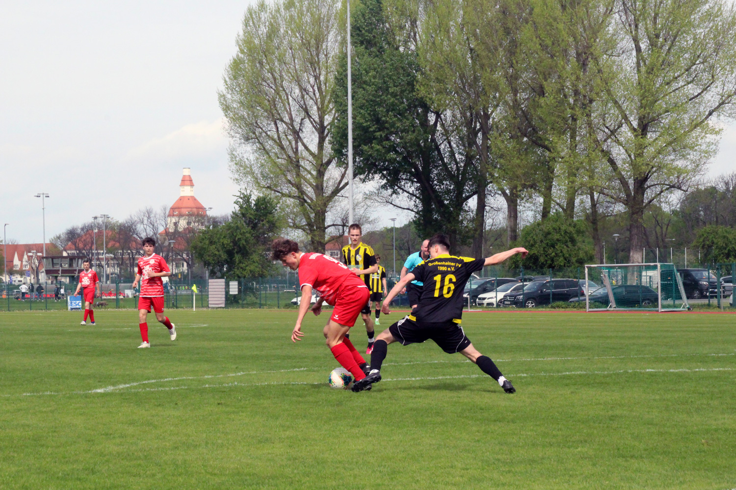 Das Spiel beginnt jedoch überhaupt nicht nach dem Geschmack des Sportclubs. Die Gäste aus Großenhain sorgen bereits in der ersten Spielminute für die Führung der Schwarz-Gelben. Für den DSC ist es der Weckruf, denn nach dem 2:2 im Hinspiel wollte man diesmal den GFV unbedingt schlagen. Und so sorgt Torjäger Nils Schöttler bereits zwei Minuten später für den Ausgleich. Die Schwarz-Roten kommen zusehends immer besser in die Partie und bestimmen diese in der Folge. Vor allem in der Schlussphase taucht der DSC immer wieder gefährlich vor dem Tor der Gäste auf. Nils Schöttler steht dabei zweimal alleine vorm Großenhainer Keeper, der jedoch jeweils gut pariert. Auch weitere Abschlussmöglichkeiten werden vergeben. Eine Führung zur Pause wäre jedenfalls verdient gewesen, bleibt aber aus.
