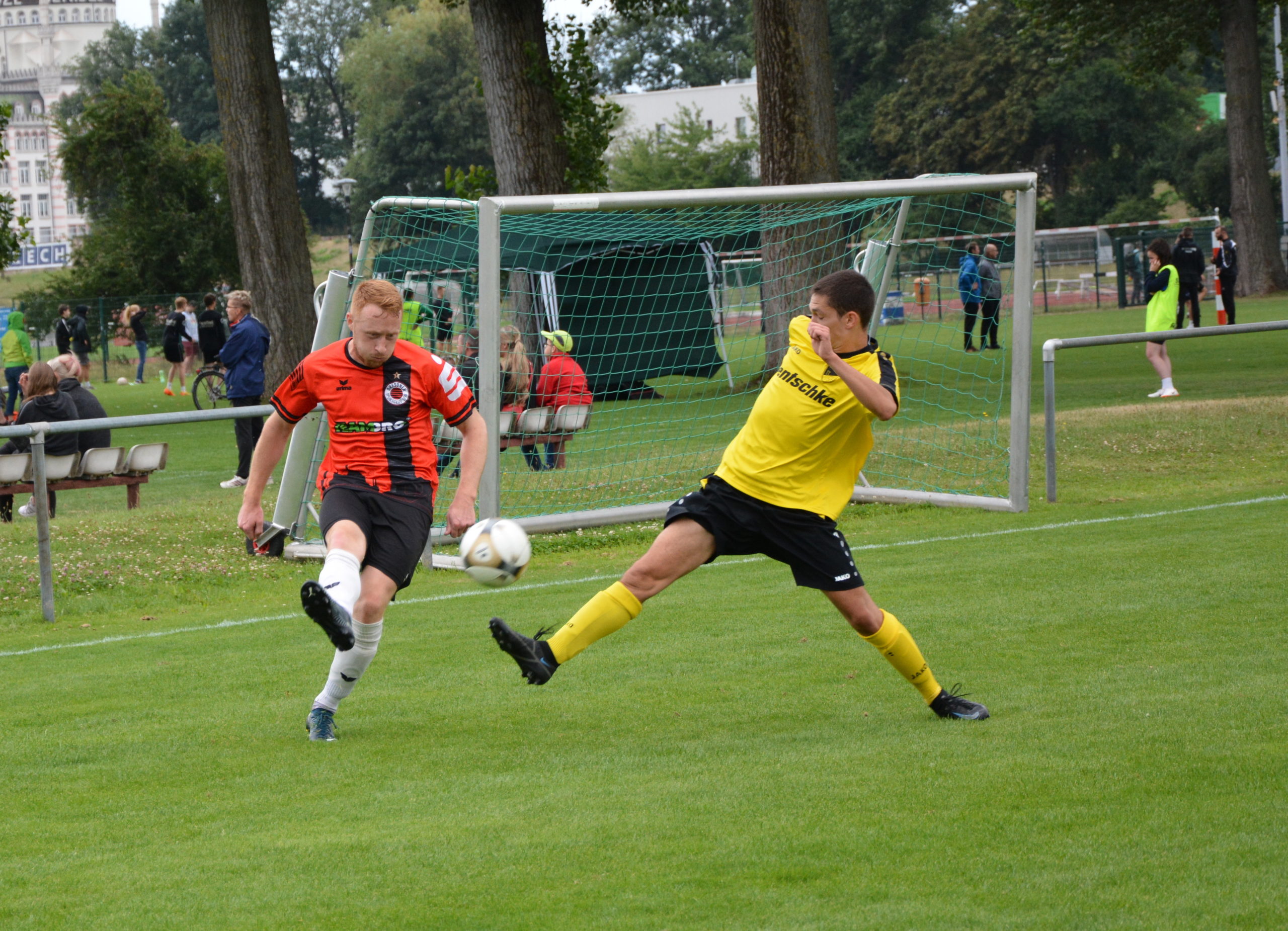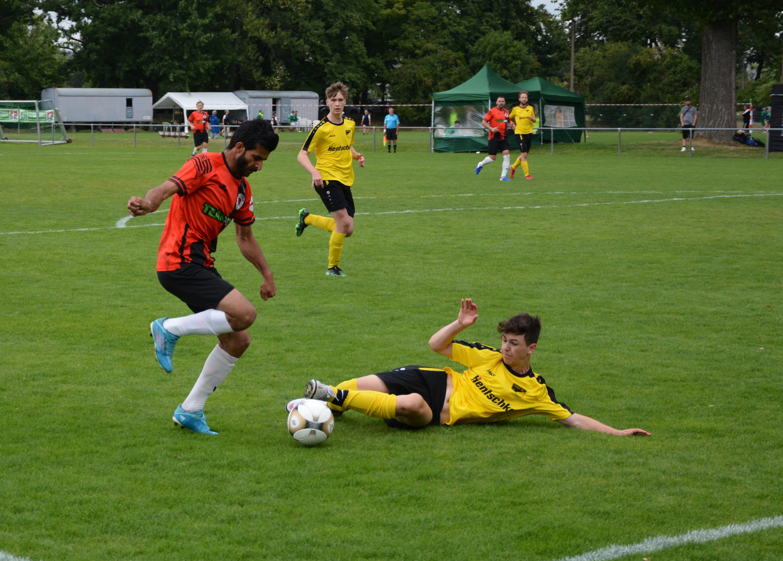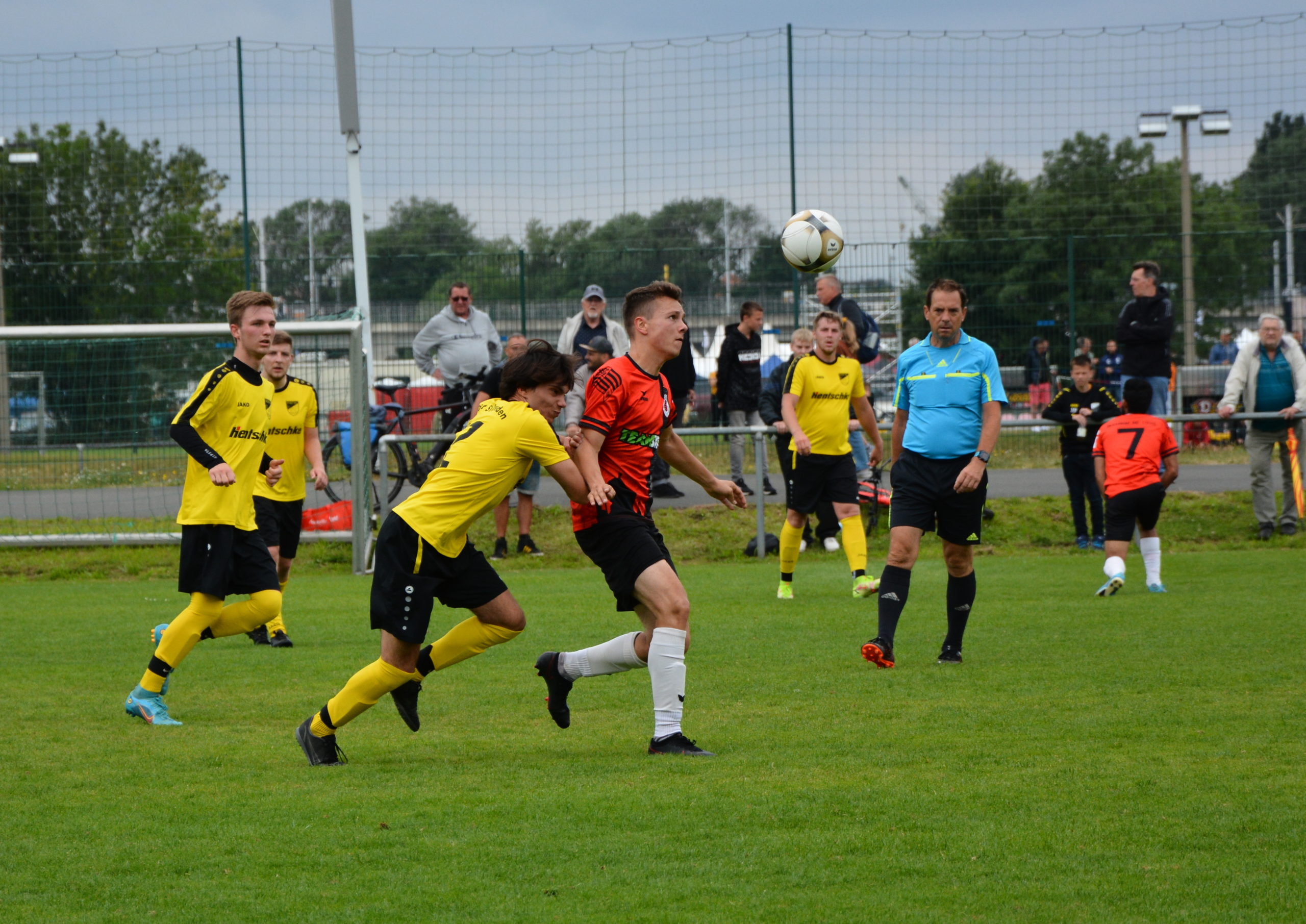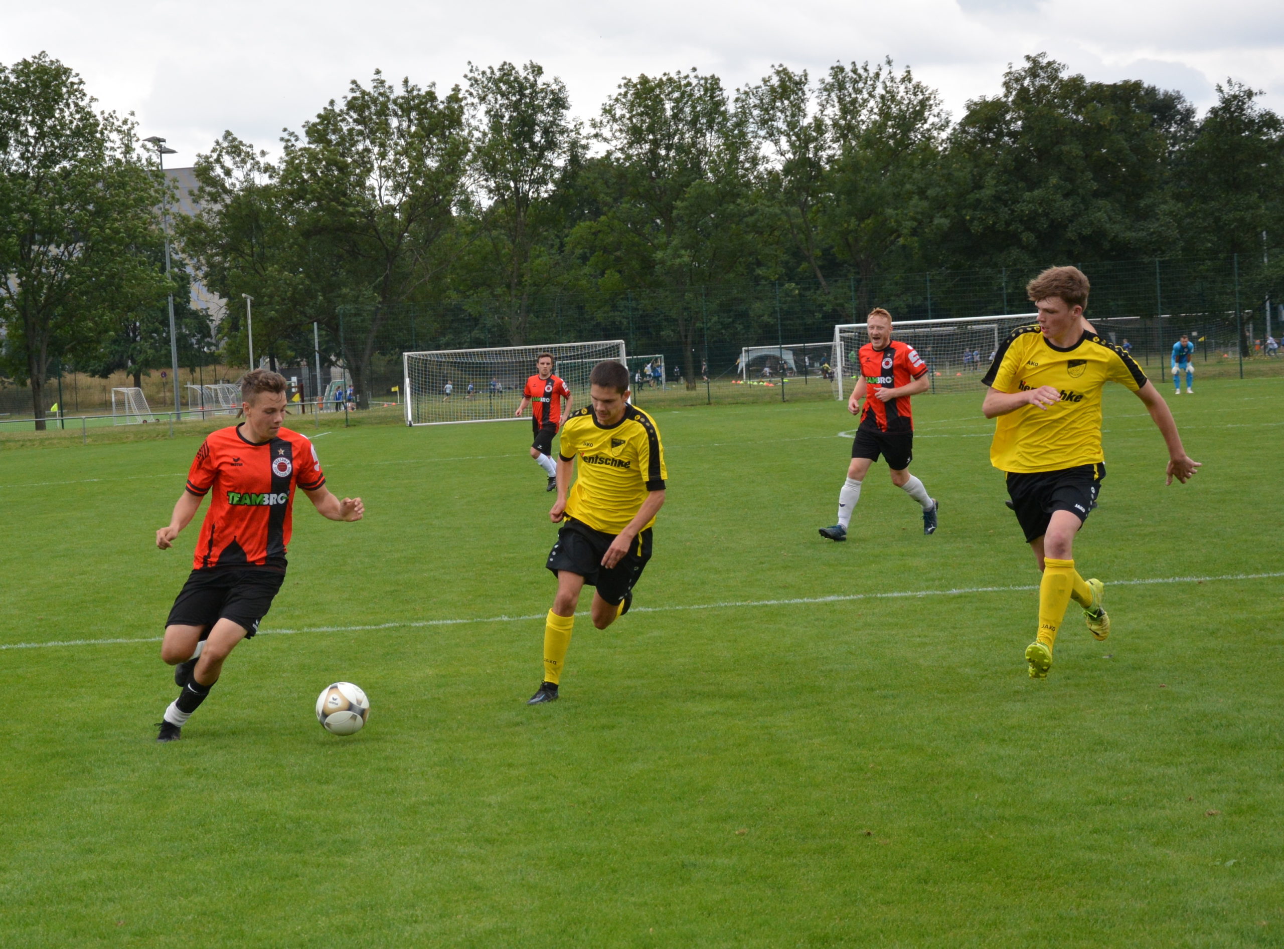Insgesamt 15 Spieler stehen bei diesem ersten Test der Saison 2022/2023 zur Verfügung. Die erste Möglichkeit der Partie kann der Sportclub für sich verbuchen. Nach Vorlage von Adib Al Akied setzt Pascal Hänisch seinen Schuss über das Tor. Der Post SV geht nach 15 Spielminuten mit der ersten guten Offensivaktion in Führung. Bei einem schnell gespielten Angriff über die rechte Seite bringt Fynn Hoppe den Ball flach in die Mitte. Am ersten Pfosten steht Tommy Winkler und schiebt das Leder über die Linie. Fünf Minuten nach der Führung verhindert der Pfosten den Ausgleich. Nach feiner Hackenablage von Hänisch trifft Al Akied nur das Aluminium. Erneut Al Akied (22.) und Julius Wetzel (27.) verpassen aus aussichtsreicher Position den Ausgleich. Auf der Gegenseite zeigt sich das Team von der Hebbelstrasse dagegen an diesem Vormittag äußerst effektiv. Wieder spielen sie einen Konter über die rechte Seite gut aus. Nach einer Hereingabe von Paul Klette steht am zweiten Pfosten Albert Graf frei und trifft zum 0:2. Kurz darauf geht der Abschluss von Fynn Hoppe nur knapp am Pfosten vorbei. Auch wenn der DSC mehr Ballbesitz hat kann der Gegner in der erste Hälfte noch zwei Mal treffen. In der 43.Minute kommt nach einem Freistoß und einer Kopfballablage Fynn Hoppe im Fünfmeterraum an den Ball und erhöht auf 0:3. Der 0:4 Halbzeitstand wird dann erneut über die rechte Seite vorbereitet. Fynn Hoppe passt überlegt in den Rückraum der Abwehr wo Tommy Winkler zu seinem zweiten Treffer vollendet.