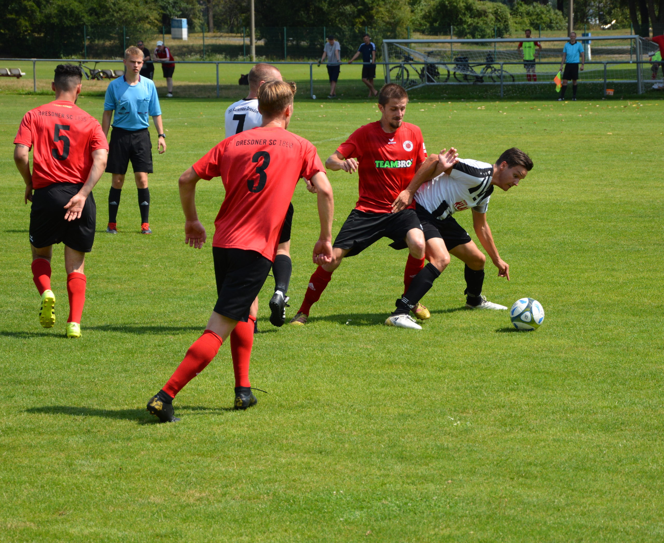 Auch in der zweiten Halbzeit kommt der Dresdner SC besser in das Spiel. Nach einem Lattenknaller von Maximilian Kniese gelangt Jonas Buchmann an den Ball. Sein Abschluss kann erst knapp hinter der Linie geklärt werden und so geht der DSC mit 2:1 in Führung. In der Folge müssen beiden Mannschaften den tropischen Temperaturen Tribut zollen und der Spielfluss wird öfters unterbrochen. Die Hausherren behalten aber auch in dieser Phase die Oberhand und kommen noch zu zwei Foulelfmetern. Den Ersten setzt Kevin Tietz in der 62.min neben das Tor, den Zweiten verwandelt Jonas Buchmann dann sicher zum 3:1 Endstand (79.).